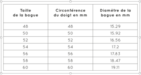 - Référez-vous à notre guide des tailles ci dessous pour convertir le diamètre en taille de bague correspondante.